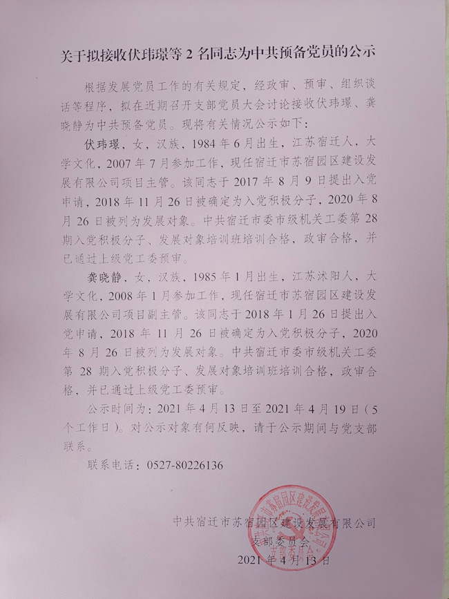 關于擬接收伏瑋璟等2名同志為中共預備黨員的公示