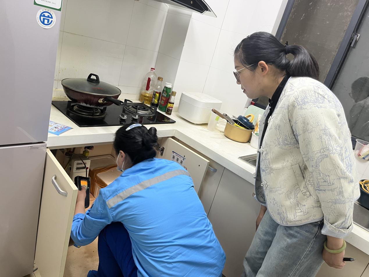 工作人員對燃氣用戶開展逐戶檢查,重點對天然氣接口軟管是否老化、燃氣器具是否超期使用、是否有熄火保護措施,燃氣閥門是否正常使用等問題進行全面檢查。在檢查過程中,發(fā)現(xiàn)廚房操作間積堆物品、線路交叉重疊等現(xiàn)象,要求客戶立即整改。