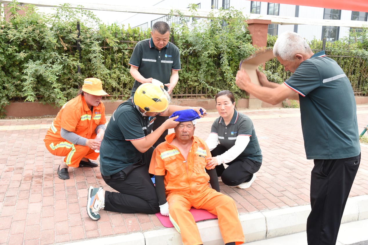 此次演練模擬鏡泊湖路一名環(huán)衛(wèi)工人在作業(yè)過程中,突然感到頭暈、心慌乏力,立即向主管人員電話求助。主管人員隨即趕到現(xiàn)場查看情況,發(fā)現(xiàn)環(huán)衛(wèi)工人躺坐在現(xiàn)場,面色潮紅、大汗淋漓,精神狀況不佳,系中暑跡象,立即向項目經(jīng)理報告,聯(lián)系應急救援人員,并呼喊附近作業(yè)人員將其攙扶到陰涼處,解開衣扣散熱,應急救援人員趕到現(xiàn)場后,立即用濕毛巾、酒精棉擦拭身體,涂上清涼油,喂服藿香正氣水、淡鹽水......,經(jīng)過初步救護,中暑人員癥狀得以緩解后,隨即將其送往園區(qū)社區(qū)衛(wèi)生服務中心進一步治療。