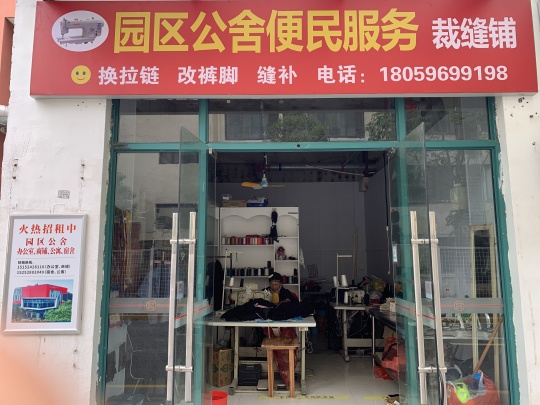 園區(qū)公舍便民服務(wù)裁縫鋪位于東吳尚城一層外圍沿街商鋪西首,經(jīng)營(yíng)范圍:縫補(bǔ)衣物、修扁褲腳、更換拉鏈等修補(bǔ)衣物業(yè)務(wù)。