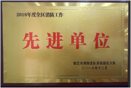 公司在2018年度全區(qū)消防安全工作評定中,喜獲“2018年度全區(qū)消防工作先進單位”榮譽稱號,此次消防安全工作由宿遷市消防支隊蘇宿園區(qū)大隊評定。