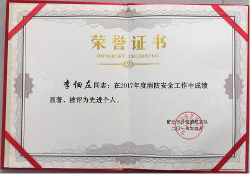5月2日下午,宿遷市公安消防支隊(duì)召開了“全市一級消防安全重點(diǎn)單位“工作會(huì)議,建發(fā)公司物業(yè)部安防主管李佃左同志在2017年消防安全工作中成績顯著,被評為先進(jìn)個(gè)人。