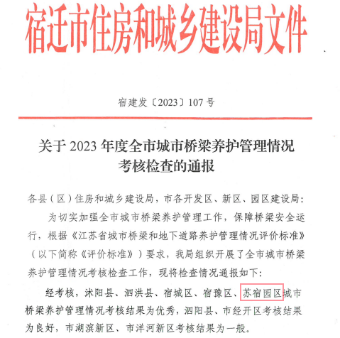 近日,宿遷市住房和城鄉(xiāng)建設(shè)局下發(fā)2023年度全市城市橋梁養(yǎng)護管理情況考核檢查通報,園區(qū)城市橋梁養(yǎng)護管理工作再獲佳績。